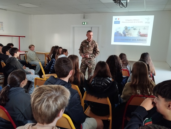 Lundi 8 décembre, les élèves des 4 ème ont écouté les informations données par le Commandant Civallero intervenant dans le cadre de la Délégation Militaire Départementale de Vendée. Ainsi, il a pu enrichir les connaissances des élèves qui avaient étudié la Défense dans les cours d’EMC la semaine dernière.